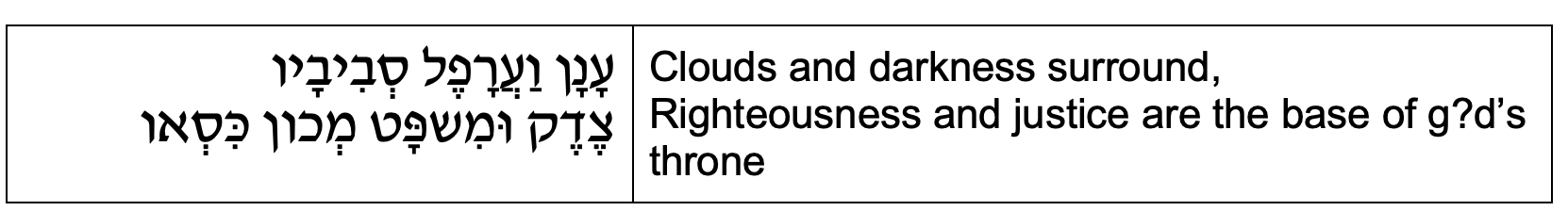 In the poetic imagination of the psalmist, g?d-as-King sits on a throne made not of gold and jewels, but made of the values of righteousness and justice. That is a statement of the kind of world we should be working towards, and the kind of leaders we need to have and be. In our sacred heritage, g?d-as-King uses g?d’s power not for war and subjugation, but for justice. g?d-as-King cares for the widow and the orphan. Do we? When we read this as poetry, we give it back its power to move us, to imagine what a better world could look like.