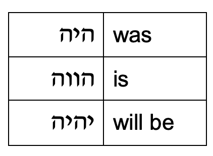 But just like any Hebrew word, yud hey vav hey has a root. The root is, “is!” You can see it in the Hebrew verb form , “to be.” And in the past, present, and future tense: See how the same letters are contained in this name. The closest translation of YHVH we have is “being” or “is-ness” or “all-that-is.” And that’s very different from “Lord.”