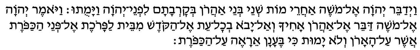God said to Moses: Tell your brother Aaron that he is not to come at will into the Shrine behind the curtain, in front of the cover that is upon the ark, lest he die; for I appear in the cloud over the cover.