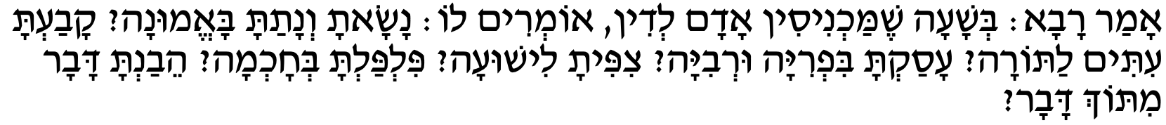 Rava said: When a person is brought to judgment, they say to him: Did you conduct business faithfully? Did you designate times for Torah study? Did you engage in procreation? Did you await salvation? Did you engage in the dialectics of wisdom or understand one matter from another? (b.Shabbat 31a)